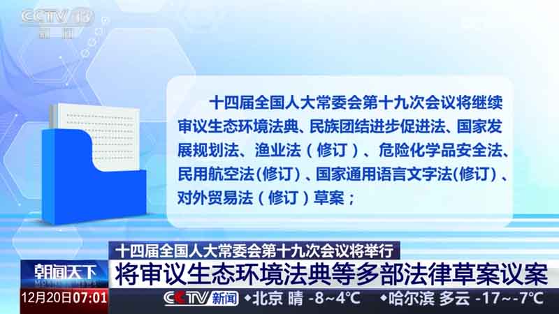 [视频]十四届全国人大常委会第十九次会议将举行 将审议生态环境法典等多部法律草案议案